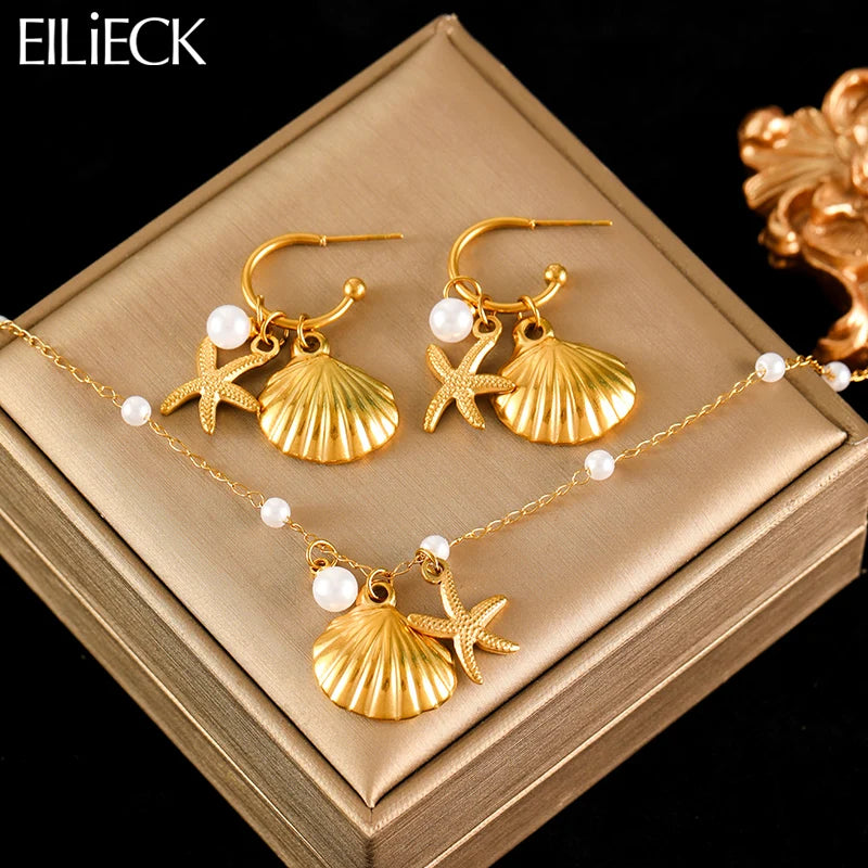 This elegant set features a golden starfish, a delicate shell, and a luminous pearl—each charm a symbol of femininity, resilience, and the quiet power of nature. Crafted from waterproof 316L stainless steel with a lasting gold finish, it’s designed to accompany you through every tide—whether you're chasing dreams or simply basking in stillness.