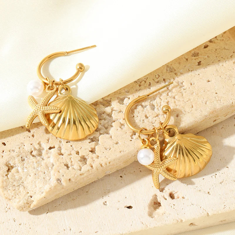with Starfish, Shell & Pearl Charms – 316L Stainless Steel, Gold Finish