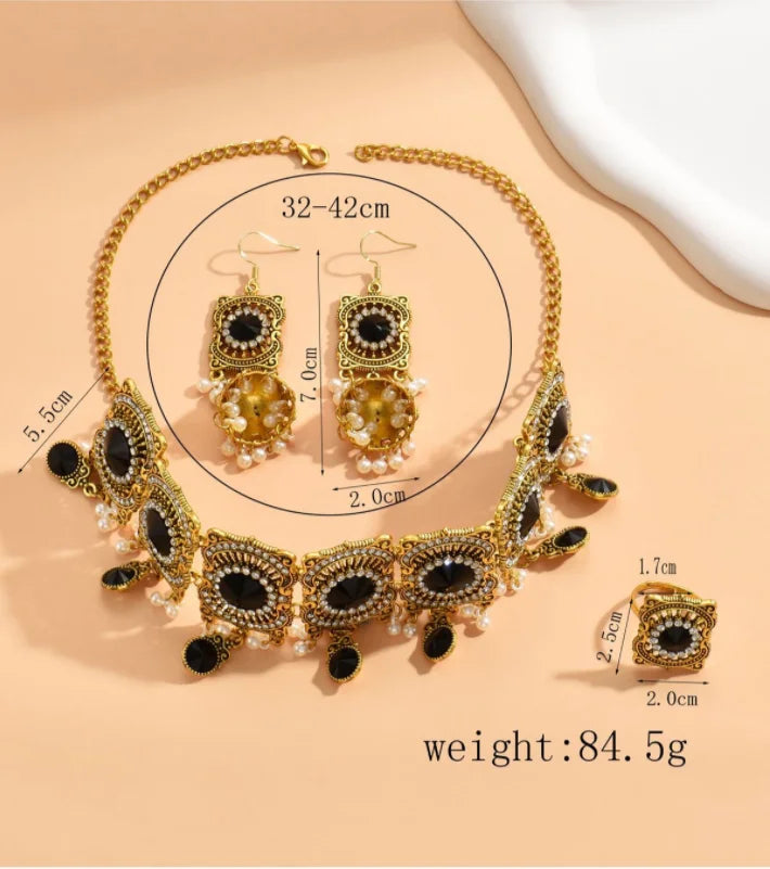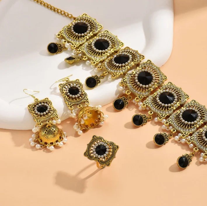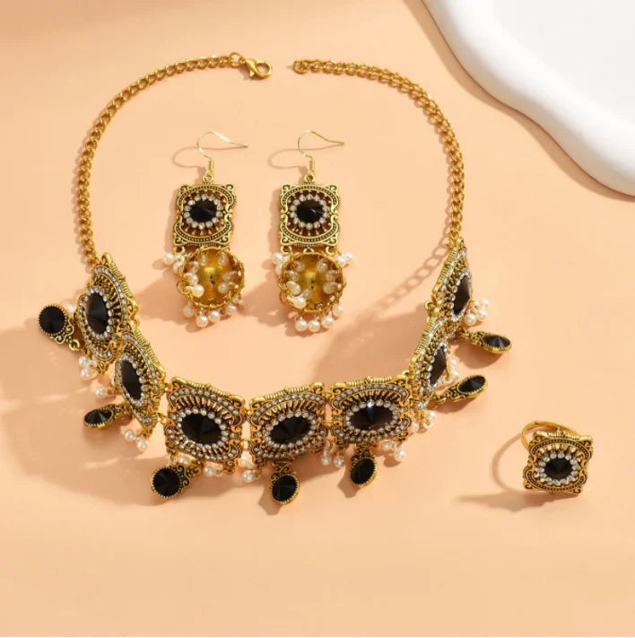 Step into a world of timeless elegance with The Joan Affair Set, a meticulously curated collection that echoes the sophistication of bygone eras. This ensemble features a shimmering gold-plated choker adorned with deep green and black rhinestones, evoking the opulence of vintage soirées. Complementing the choker is a delicate pearl-drop necklace, adding a touch of classic grace. The tassel earrings sway with every movement, reflecting light and drawing attention, while the matching ring completes the set, offering a harmonious blend of boldness and refinement.